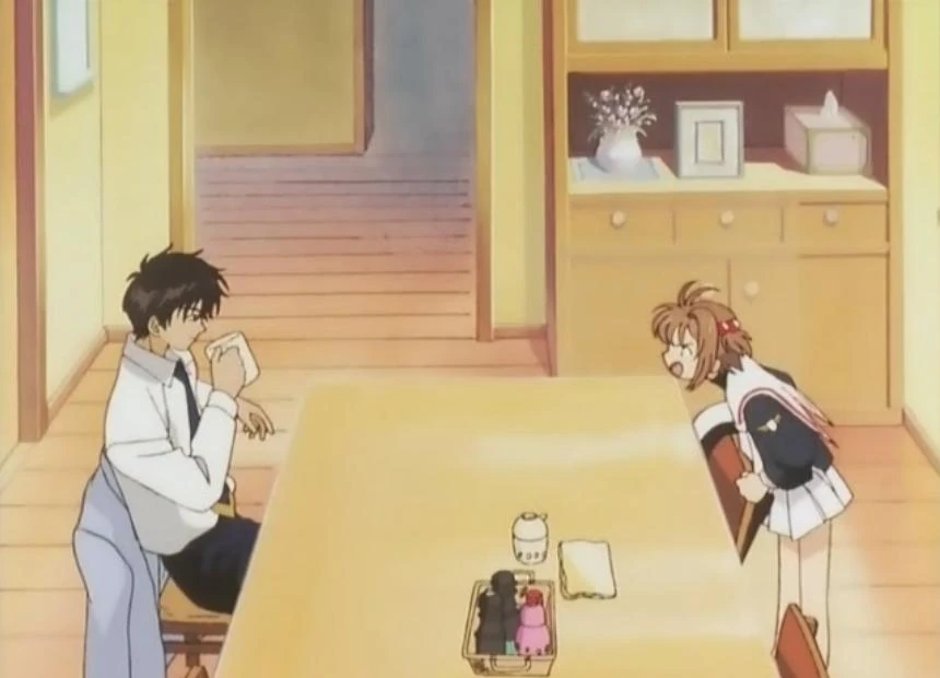 Cuando baja a la cocina, se encuentra con su hermano, quien la molesta diciéndole que sus pisadas parecían de una bestia. Sakura se imagina que ella se hace gigante y pisa a Touya. La imaginación de Sakura es interrumpida por su padre, Fujitaka Kinomoto, quien menciona alegremente, aunque sarcásticamente, que desde la mañana Sakura y Touya se llevan muy bien. Sakura, en off, menciona que su madre falleció cuando Sakura tenía tres años de edad.